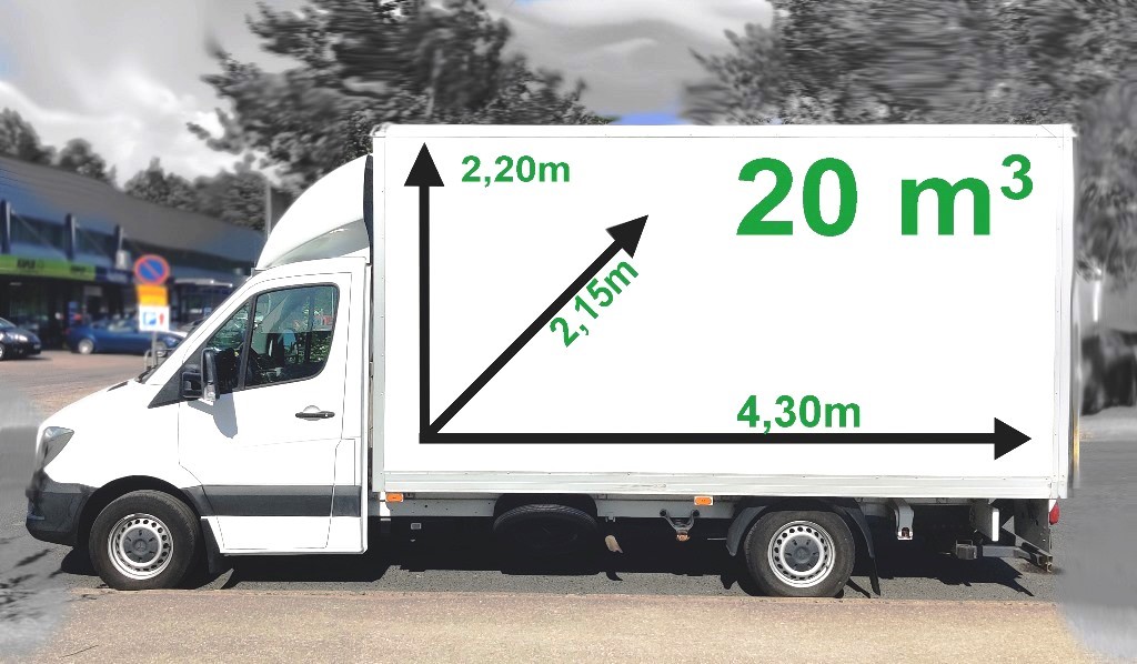 Vuokrataan pakettiauto 20m3, automaatti B-kortilla ajettava Auton korkeus: 3.20 m Korin sisämitat: Pituus 4,30m Leveys 2,15m Korkeus 2,20m