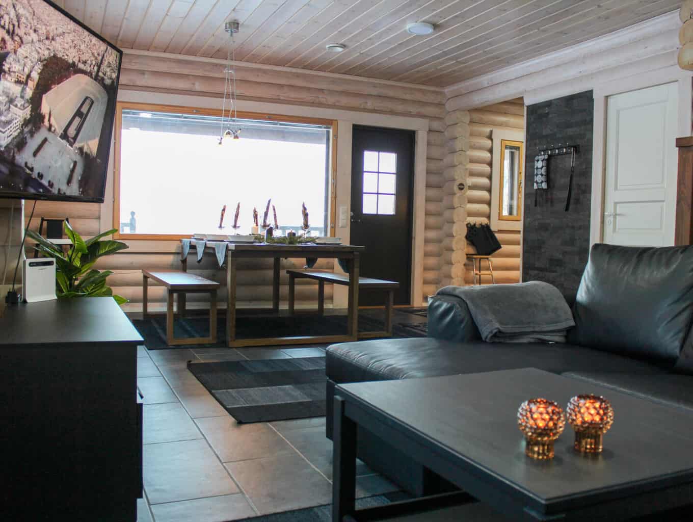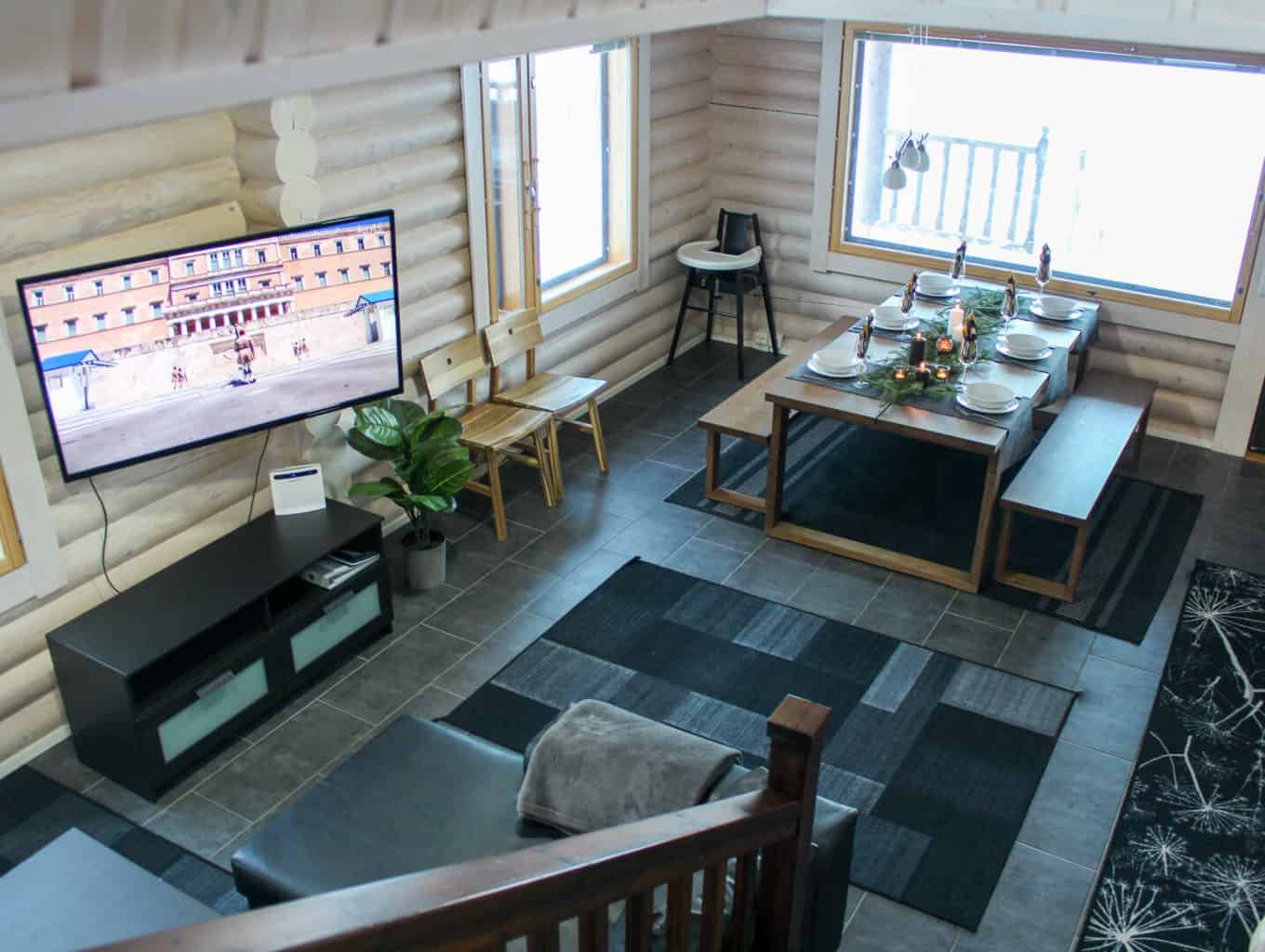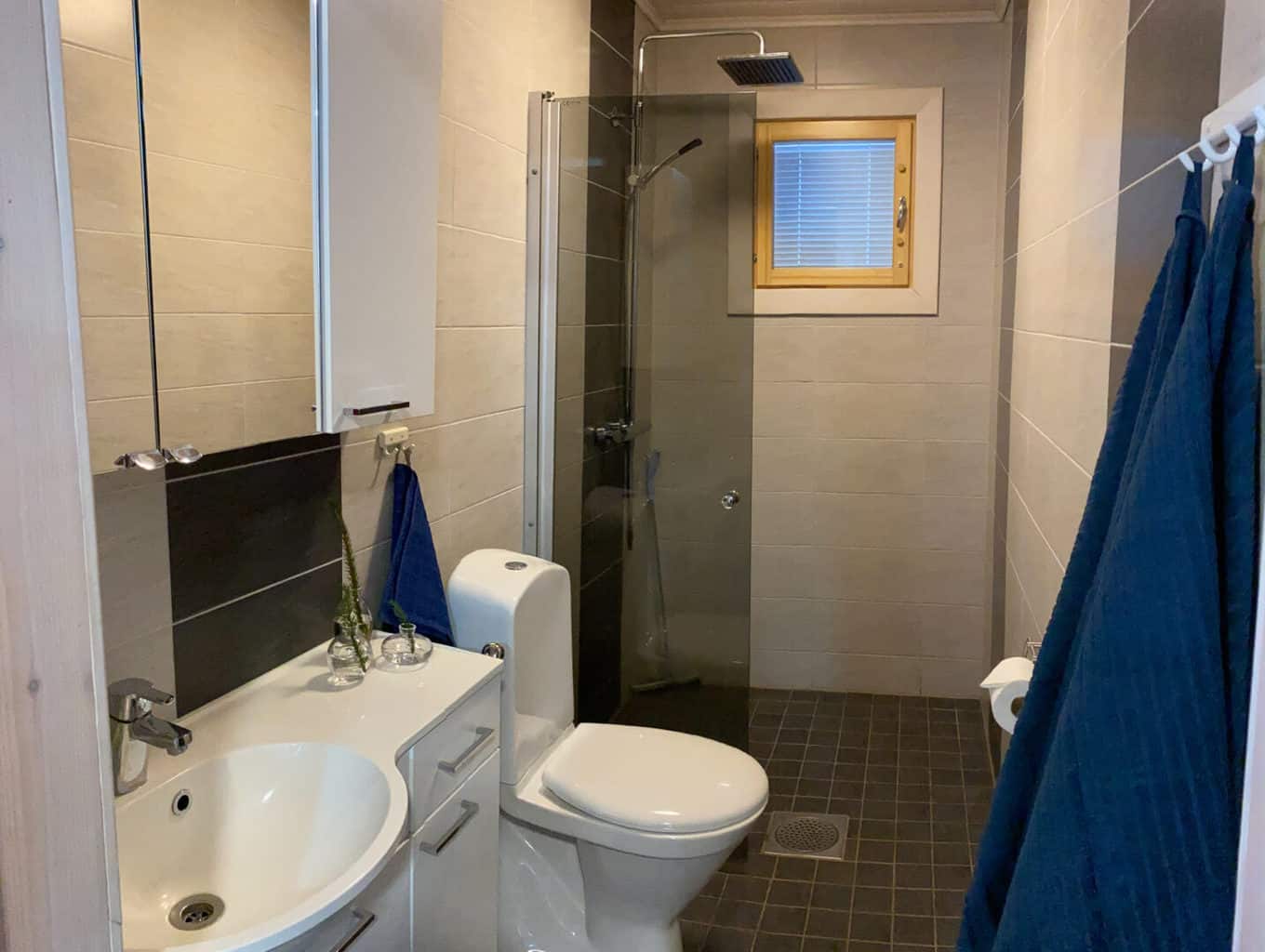 Molemmissa kerroksissa on oma wc. Alakerrassa on tilava olohuone, jossa on iso sohva, 2 televisiota (55 tuumaa), avokeittiö ja iso ruokapöytä. Samassa kerroksessa on myös puulämmitteinen sauna.